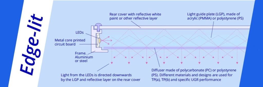 Bij deze panelen bevinden de LED’s zich langs de zijkanten van het frame. Het licht wordt via een lichtgeleidende plaat verdeeld over het oppervlak.
